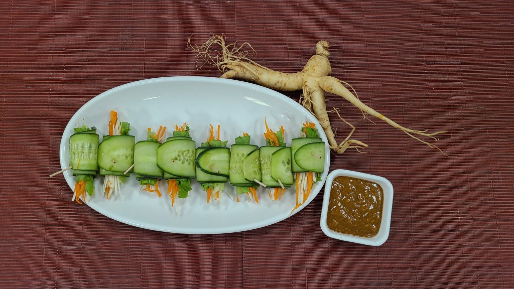 5. 再用黃瓜長片攔腰捲住油麥菜捲,並且用竹籤固定,營養又美觀鮮參翡翠如意捲就完成了。