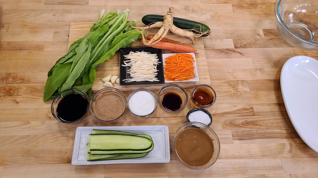 芝麻醬1湯匙、麻油1湯匙、醬油1湯匙、醋1茶匙、蒜泥1湯匙、糖1茶匙、鹽少許、美乃滋 (蛋黃醬) 1湯匙