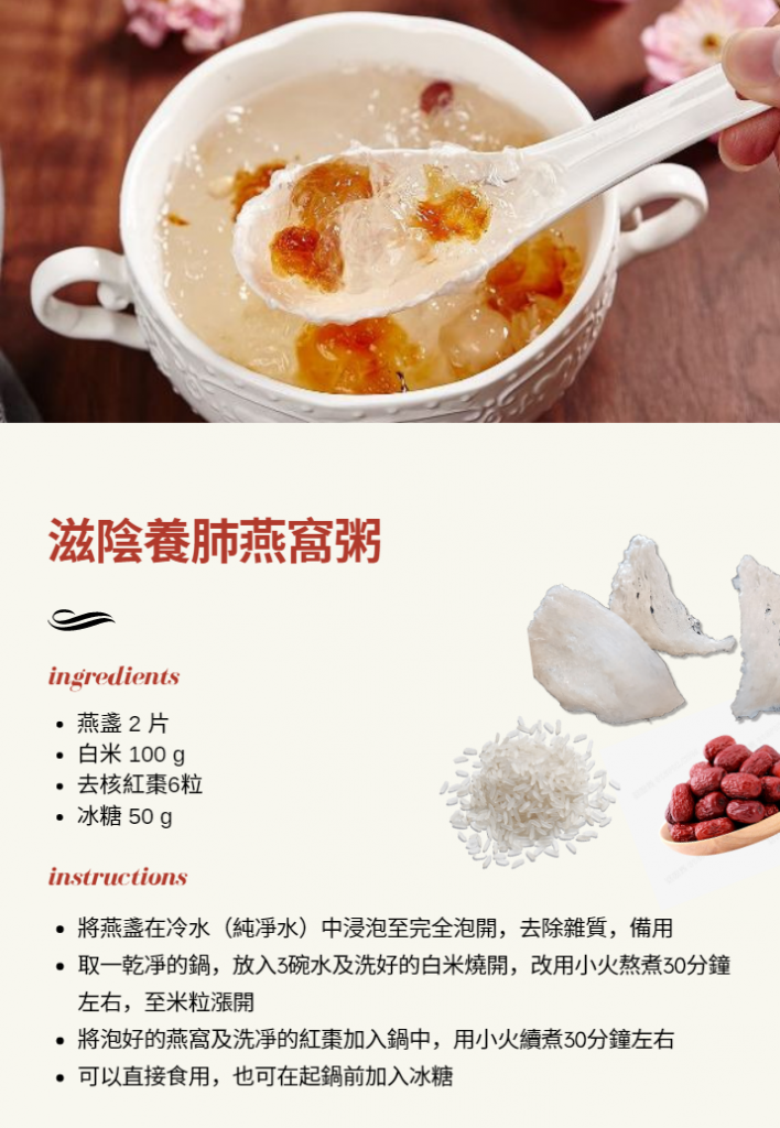 - 將燕盞在冷水(純凈水)中浸泡至完全泡開,去除雜質,備用取一乾凈的鍋,放入3碗水及洗好的白米燒開,改用小火熬煮30分鐘左右,至米粒漲開將泡好的燕窩及洗凈的紅棗加入鍋中,用小火續煮30分鐘左右可以直接食用,也可在起鍋前加入冰糖