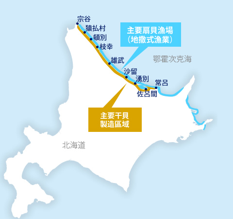 在鄂霍次克海中捕獲的扇貝中,約有15~20%的扇貝被加工為干貝。通過原料貝的搬入及保管、洗淨、首次蒸煮、脫貝、冷卻、洗淨、內臟去除、洗淨、二次煮、烤乾、乾燥、暗室處理,最後挑選修正,以完成分級與包裝。